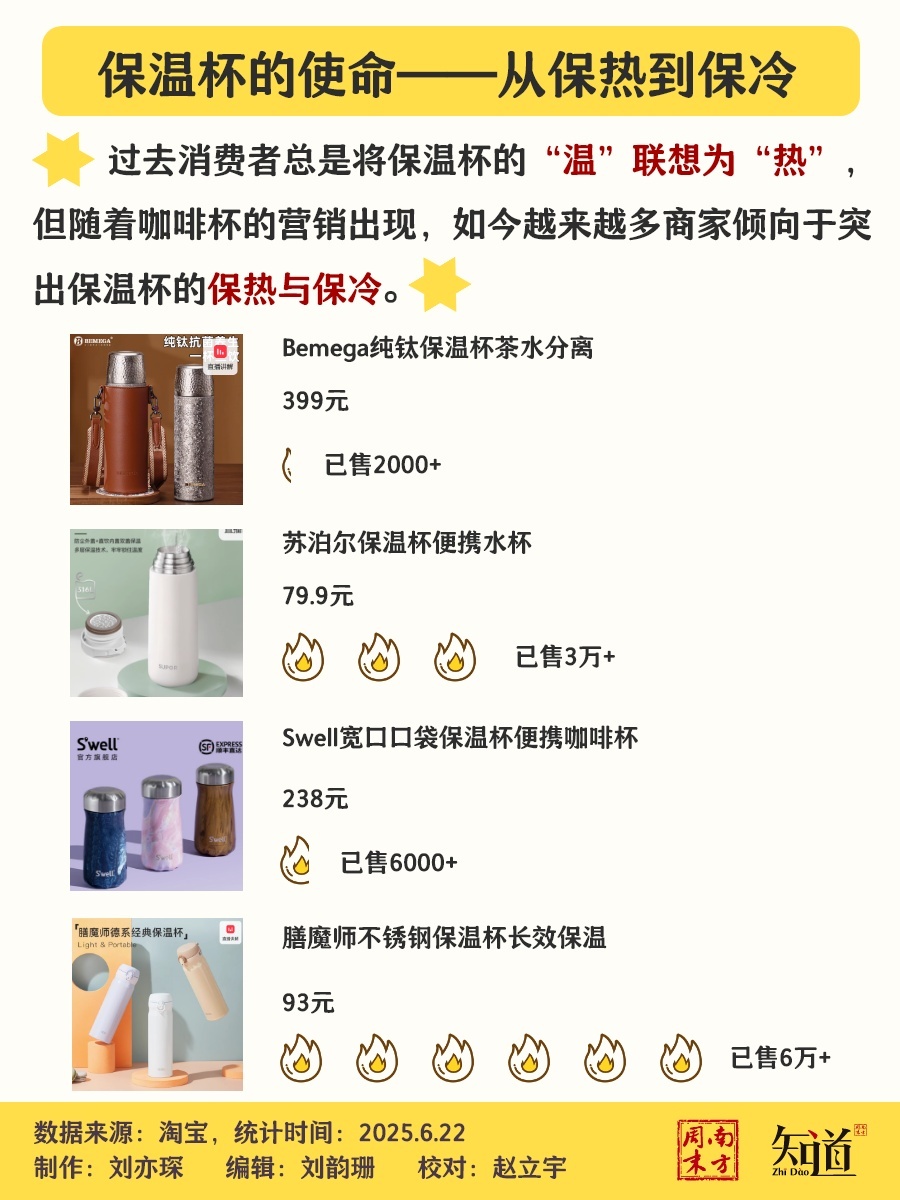 观察淘宝上保温杯的价格可以发现,百元左右的平价保温杯多乐于营销其保温性能,而千元以上的贵价保温杯则往往会打上“保冷”的标签。