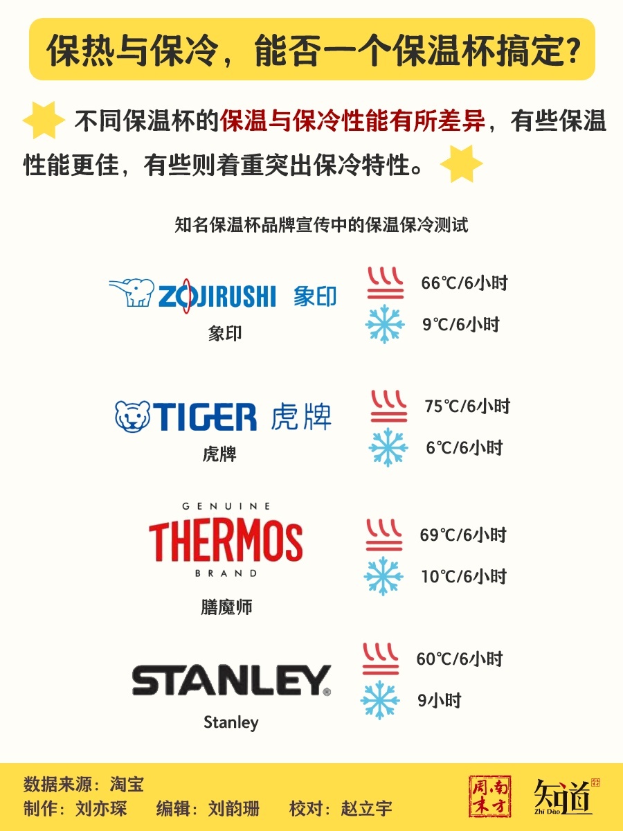 据知名保温杯品牌宣传中的保温保冷测试,发现不同品牌保温杯的保热保冷功效各有差异:有些保温性能更佳,有些则着重突出保冷特性。