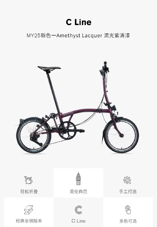 公开信息显示,BROMPTON诞生于1975年伦敦,被爱好者亲切地称之为小布,以“15秒折叠”专利技术闻名。车架采用钛合金或碳纤维,手工焊接工艺堪比奢侈品,甚至提供2000多种个性化配色方案。